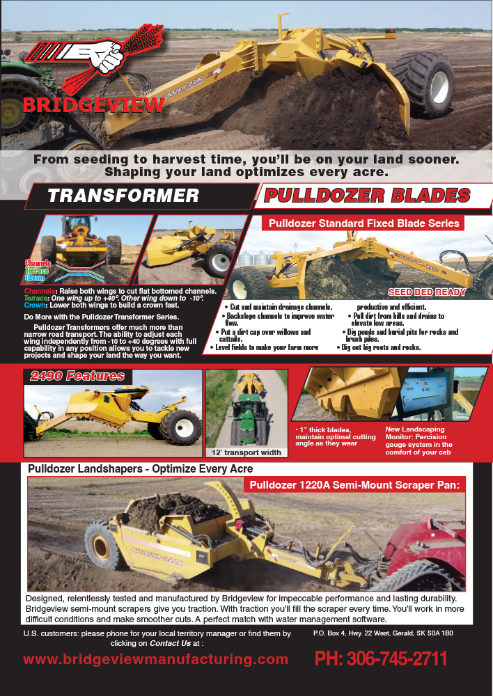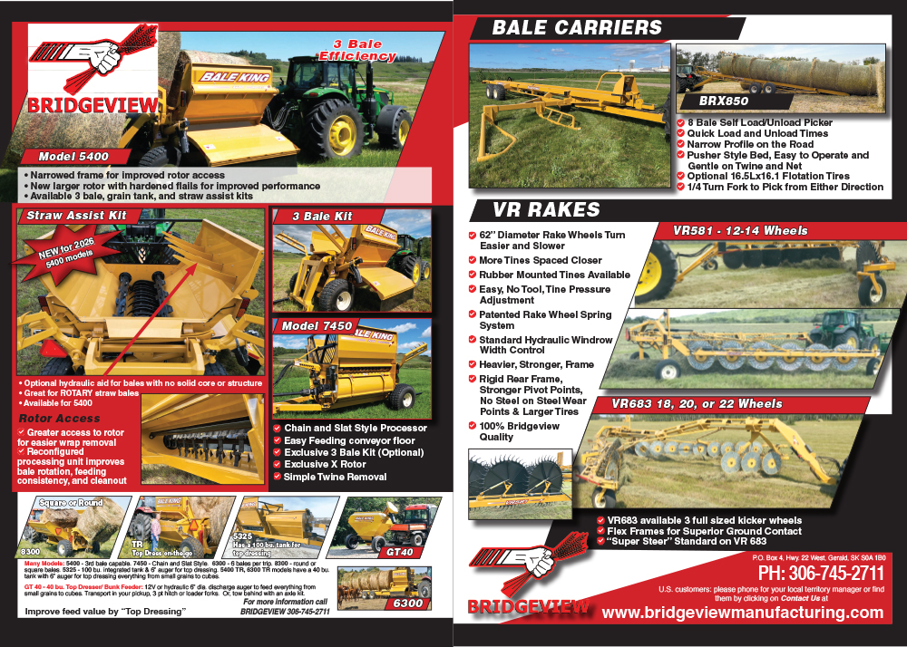 Bridgeview Manufacturing is a progressive farm machinery manufacturer located near Gerald, Sk. Our product lines include Bale King bale processors and hay rakes, Pulldozer earthmoving equipment, and Grain Express storage and handling equipment.